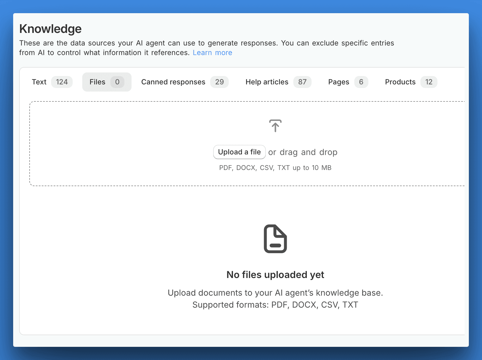 You can now upload pdf, docx, csv and txt files to your AI agent's knowledge base: