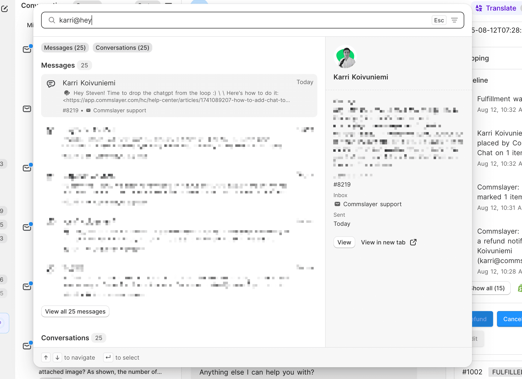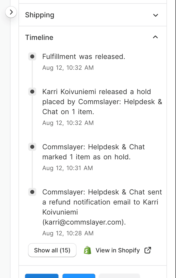 View order timeline in sidebar: See all Shopify order events (fulfillment updates, staff comments, notes) without leaving Commslayer