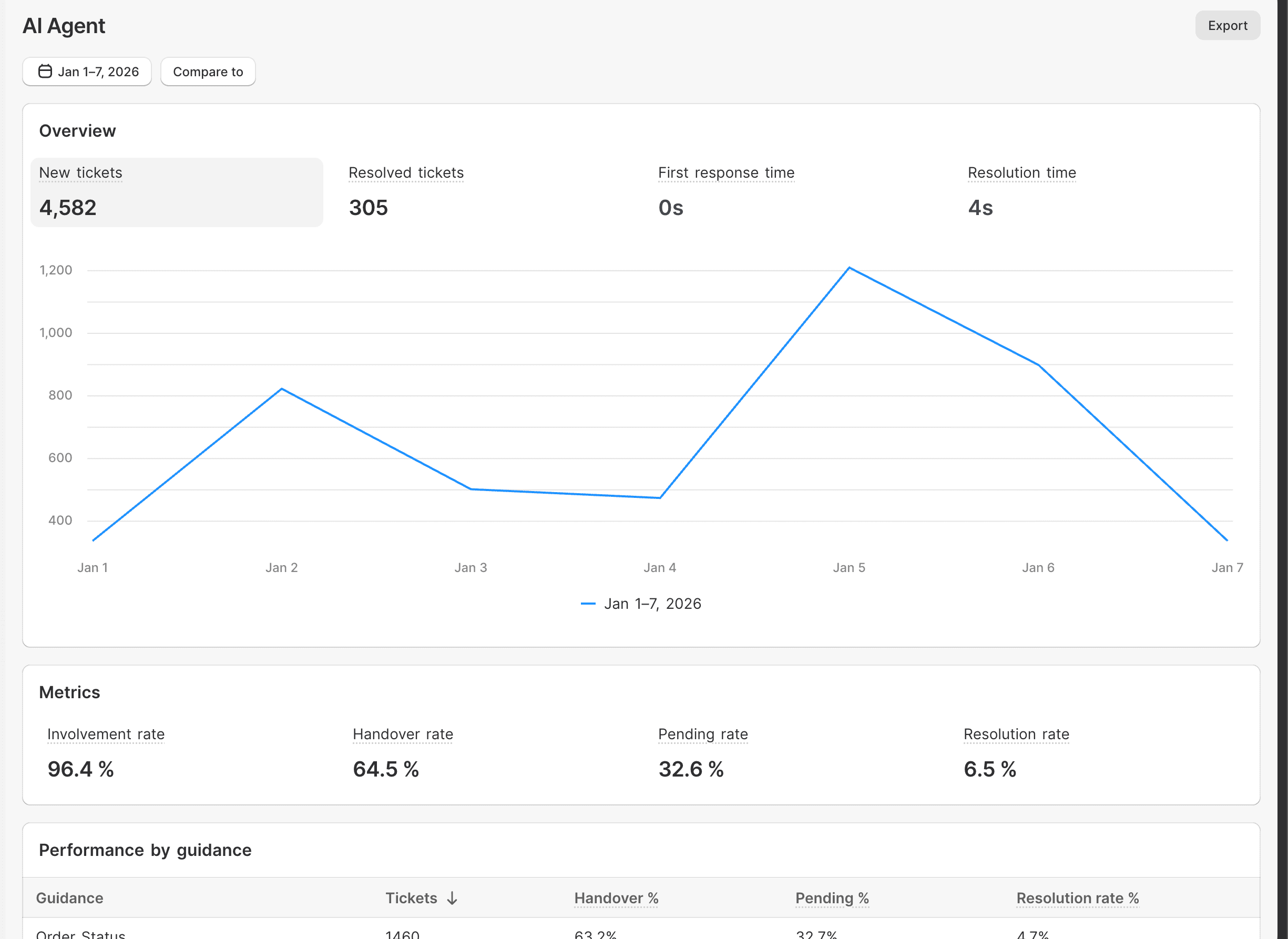 New AI Agent report: See how your AI agent is performing: involvement rate, resolution rate, handover rate, and which guidance topics are being used