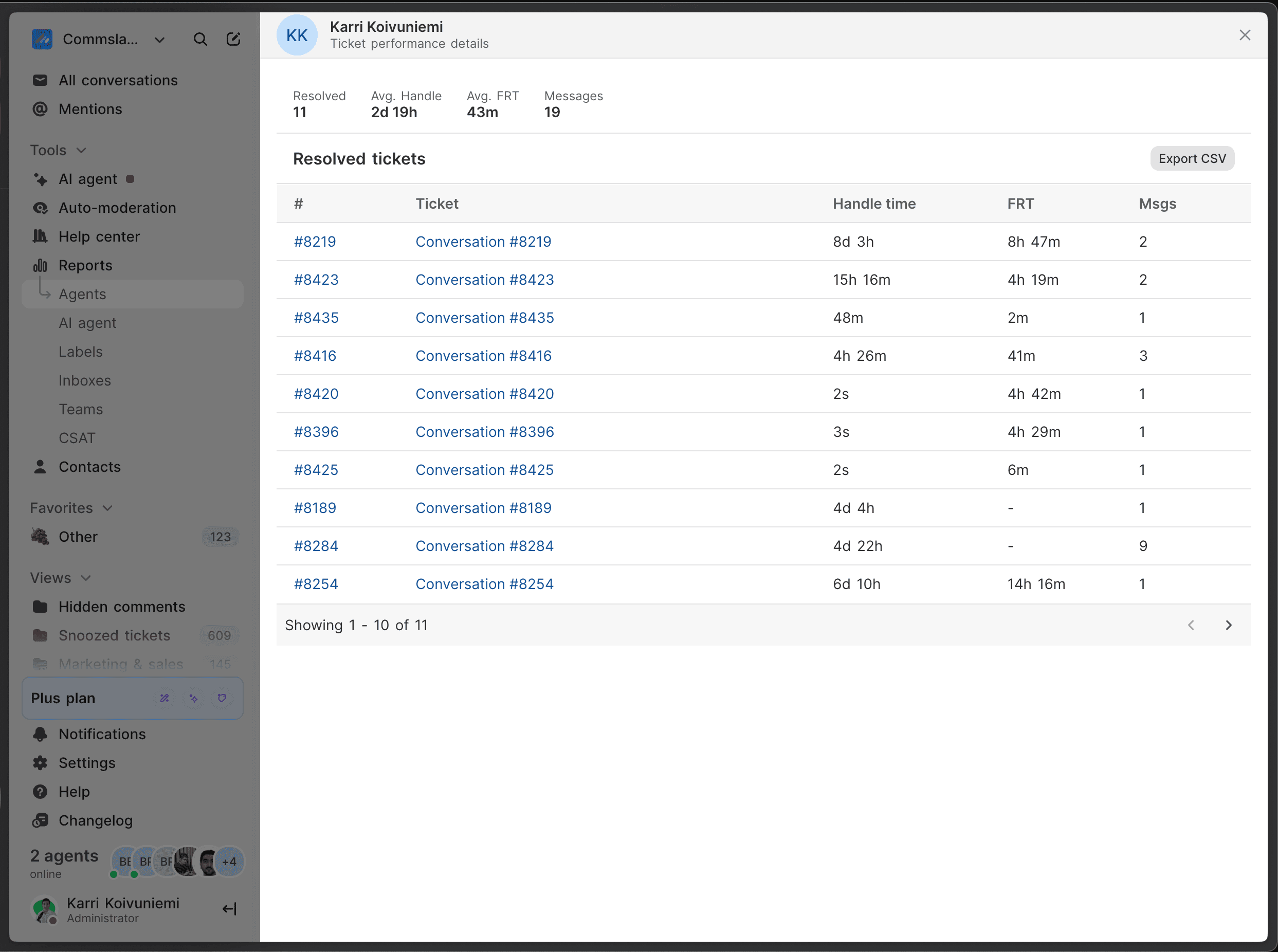 Conversations report: Browse all conversations with metrics (FRT, handle time, CSAT) in one place