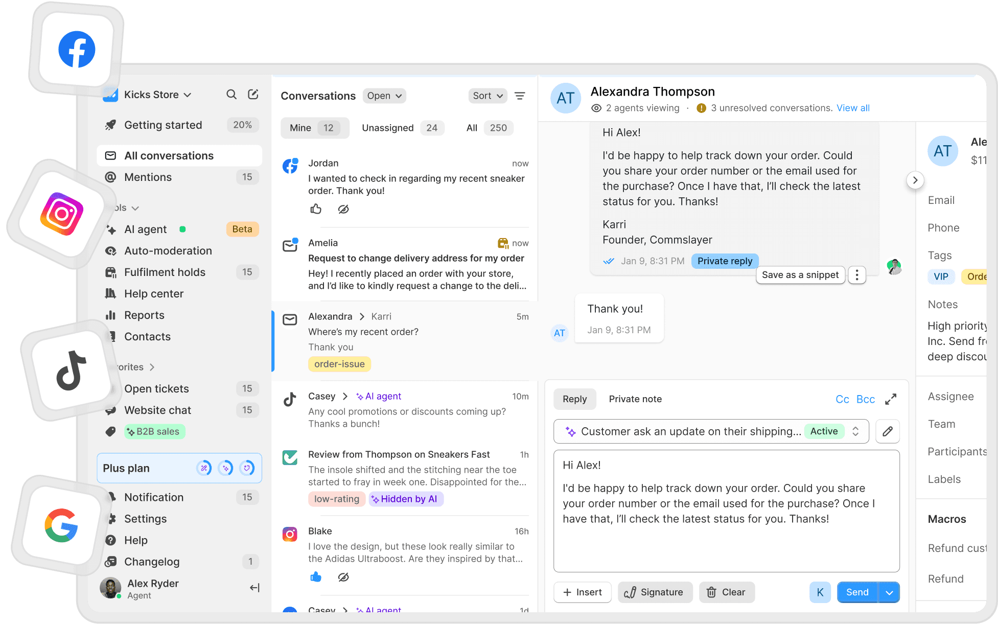 Bring Facebook, Instagram, email, and more into one app. No switching tabs, manage everything from a single inbox.