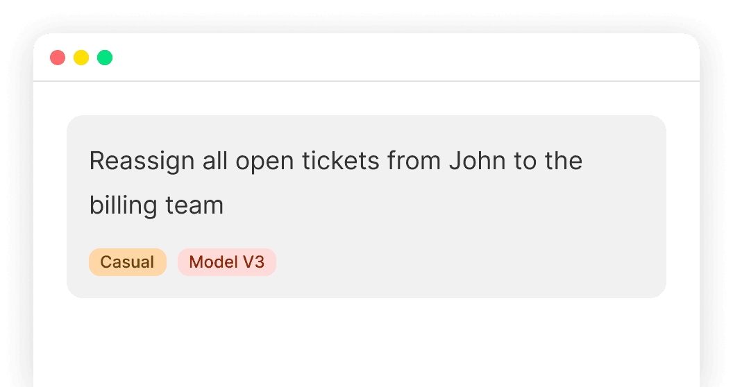 Snooze, reassign, and close tickets through conversation. Manage your queue without switching tools.